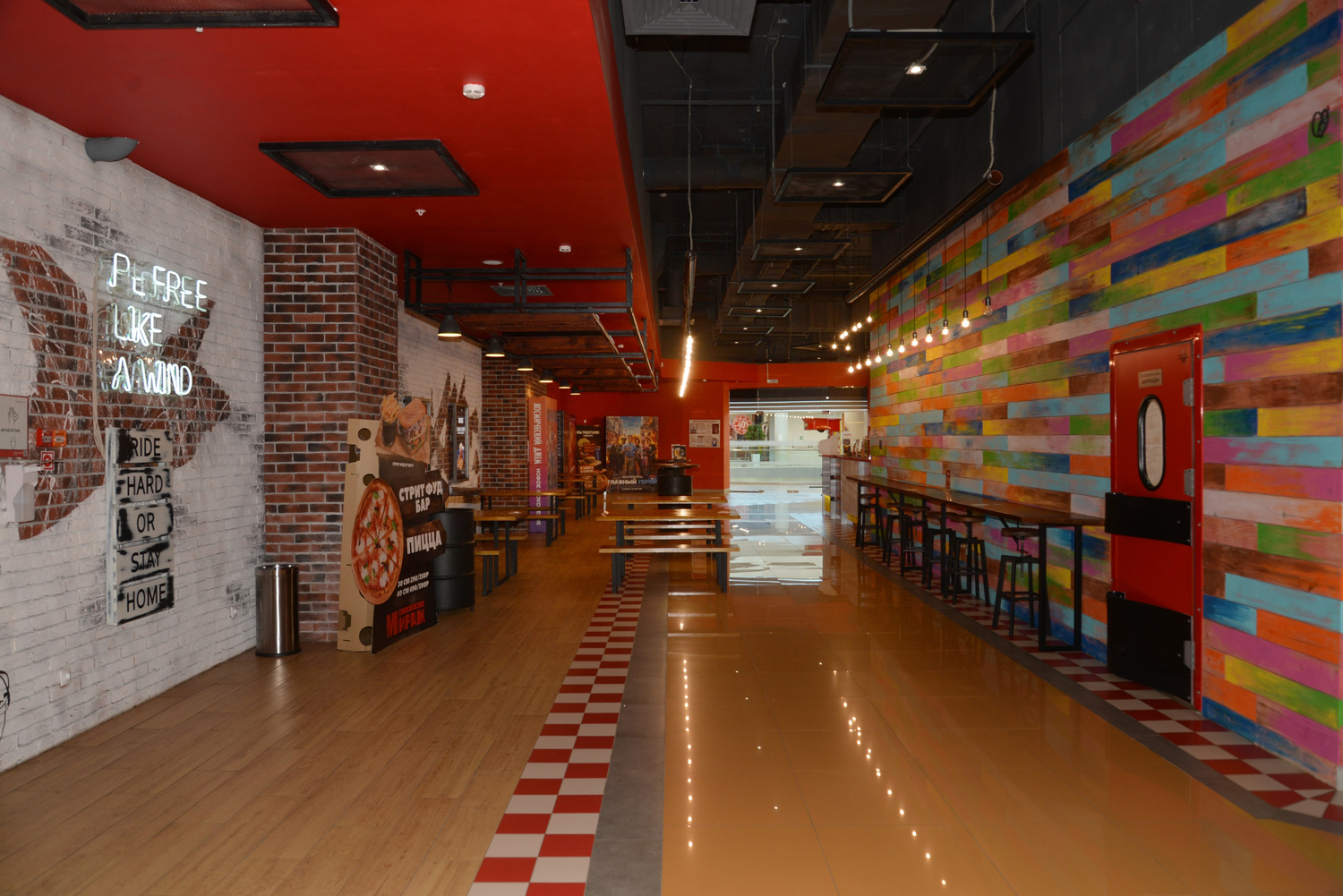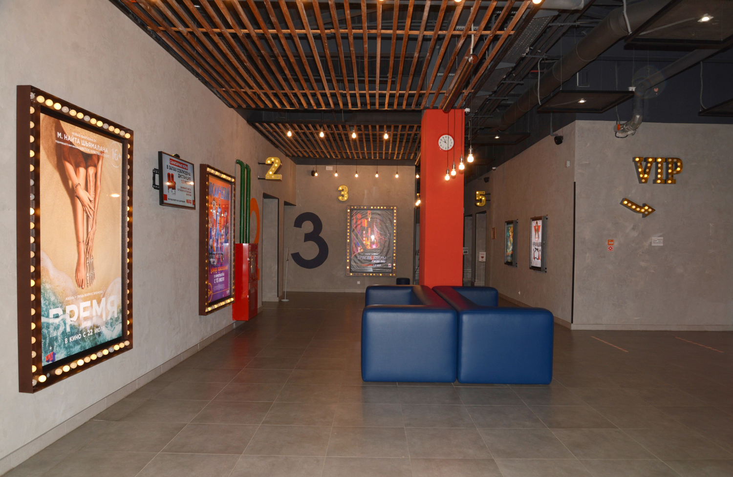 Яркий дизайн создаёт приятную обстановку и отличное настроение. Просторное фойе со стильными столиками в зоне Street Food Bar и уютные диванчики помогут приятно провести время во время ожидания сеанса. Экраны в фойе ненавязчиво транслируют актуальное расписание и информацию о привлекательных акциях.