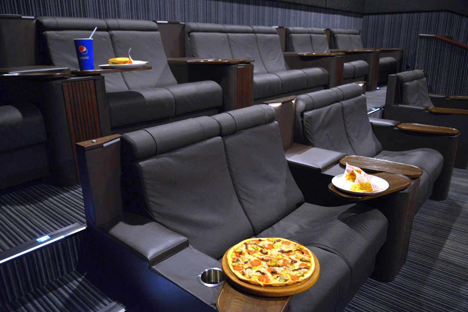 На момент отсутствия ограничительных мер действует опция заказа блюд в VIP-зал. Гости могут вызвать официанта (кнопка расположена у каждого дивана) и заказать любимые блюда и напитки, не отрываясь от просмотра фильма.